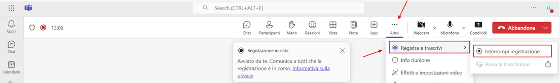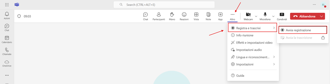 Una volta avviata la riunione, basterà selezionare Altro > Registra e trascrivi ed infine Avvia registrazione.