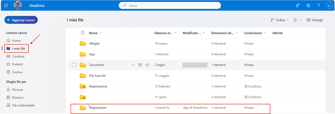 Selezionando il tab I miei file si aprirà la schermata con tutte le cartelle disponibili, tra cui Registrazioni. Al suo interno sono conservate tutte le registrazioni effettuate durante una riunione.